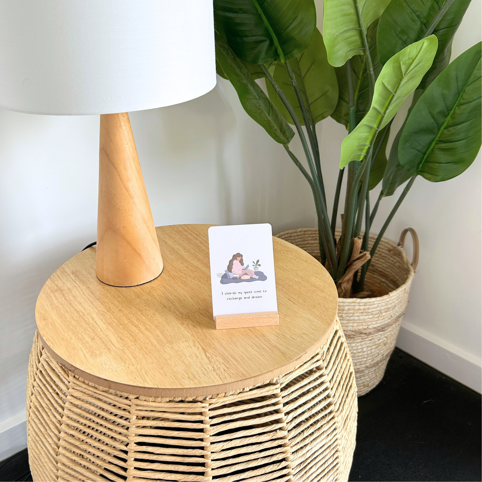 Place a card on the wooden stand and display it somewhere you’ll see often, like your desk, nightstand, or kitchen counter. You can also choose a new affirmation each day or week to set an intention or share with a loved one for inspiration.