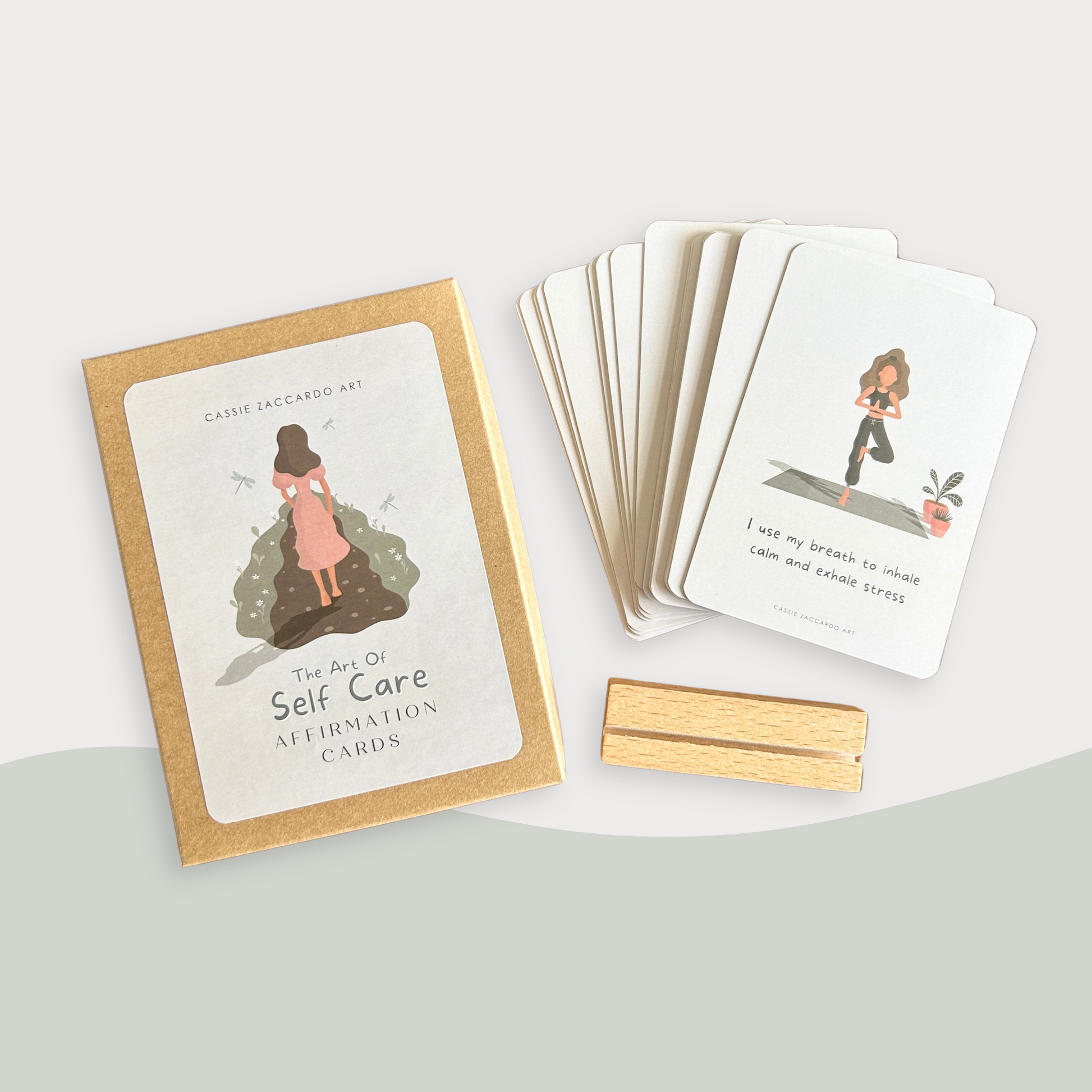 With a beautiful wooden stand included, you can display a new card each day or week. Perfect for adding a self-care reminder to your desk, bedside, or any personal space.